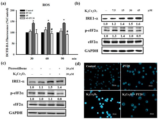Cr(VI) treatment induced ROS and ER stress in HaCaT cells, which were inhibited by PT. (a) HaCaT cells were treated with 45 μM of Cr(VI) for various time periods (30, 60, and 90 min). The amount of ROS produced in cells was determined using the fluorescence dye (DCFH-DA) and analyzed by flow cytometry. Pretreatment with PT (20 μM) could suppress ROS generation. Fluorescence units reflected the subtraction of untreated cell values and were presented as the mean ± SD from three independent experiments. * p <0.05 versus control; # p <0.05 versus the Cr(VI)-treated group. (b) Cell lysates extracted from HaCaT cells treated with several concentrations (7.5, 15, 30, and 45 μM) of Cr(VI) for 24 h were submitted to Western blot analysis to detect the protein expression of ER stress. Cr(VI) upregulated IRE1α and p-eIF2α protein expressions but p-eIF2α decreased at 45 μM of Cr(VI). (c) HaCaT cells were treated with 30 μM of Cr(VI) for 24 h. Pretreatment with PT (20 μM) inhibited ER stress-related protein expression. Western blots are representative of n = 3 experiments. (d) HaCaT cells were treated with Cr(VI) (30 μM) for 24 h. The strength of the ER tracker was enhanced by Cr(VI) and alleviated by PT pretreatment. The scale bars are 50 μM.