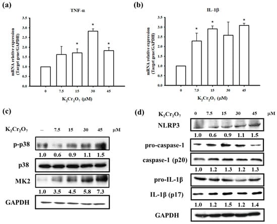 PT attenuates the Cr(VI)-induced pro-inflammatory cytokines and NLRP3 inflammasome. (a,b) The mRNA expressions of TNF-α and IL-1β were measured by real-time PCR. HaCaT cells were treated with several concentrations (7.5, 15, 30, and 45 μM) of Cr(VI) for 12 h. Data presented as the mean ± SD from three independent experiments. * p <0.05 versus controls. (c,d) The expression of the p38 MAPK/MK2 signaling pathway and NLRP3 inflammasome-associated proteins were measured by Western blot analysis following treatment with several concentrations of Cr(VI) for 24 h. (e,f) The cells were pretreated with PT (20 μM) for 1 h and then treated with Cr(VI) (30 μM) for an additional 12 h. Real-time PCR showed that the mRNA levels of pro-inflammatory cytokines, TNF-α and IL-1β decreased after treatment with PT. (g) Western blot analysis demonstrated that the activation of the p38 MAPK/MK2 signaling pathway and the NLRP3 inflammasome was suppressed by PT. Western blots are representative of n = 3 experiments.