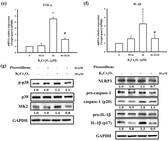 Pterostilbene inhibited inflammation and ROS production in chondrocytes by activating the Nrf2 pathway [51]. Our in vivo study further demonstrated that Cr(VI) solution produced cutaneous inflammation in the mouse ear (Figure 2). The skin reaction was accompanied by a prominent erythema and the increase in ear thickness, keratinocyte impairment, and inflammatory cell infiltration. In contrast, PT and NAC attenuated the formation of ear erythema, inflammatory cell infiltration, and ear thickness. In the mouse skin tissues, the results indicated that PT significantly suppressed Cr(VI)-elevated TNF-α and IL-1β expression (Figure 3). Furthermore, PT pretreatment significantly inhibited ROS generation in HaCaT cells (Figure 6a). Previous research has shown that PT attenuated early brain injury via the inhibition of the NLRP3 inflammasome and Nox2-related oxidative stress [52]. We found that PT significantly inhibited the Cr(VI)-induced expression of NLRP3, cleaved-caspase 1 and cleaved-IL-1β (Figure 7f,g).