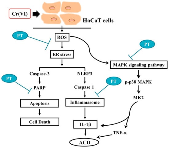 We demonstrated the mechanisms underlying the molecular action of Cr(VI)-induced inflammation and apoptosis in keratinocytes (Figure 8). Furthermore, the results found that PT attenuated Cr(VI) treatment-induced ROS generation and ER stress in HaCaT cells. PT inhibited pro-inflammatory cytokine production by regulating the p38 MAPK/MK2 pathway and NLRP3-inflammasome. In addition, PT eliminated Cr(VI)-triggered apoptosis. Our in vivo evidence demonstrated that PT prevented Cr(VI)-induced allergic contact dermatitis. These findings suggest that PT can be considered to have a potential therapeutic value in the prevention and rescue of Cr(VI) skin disease.