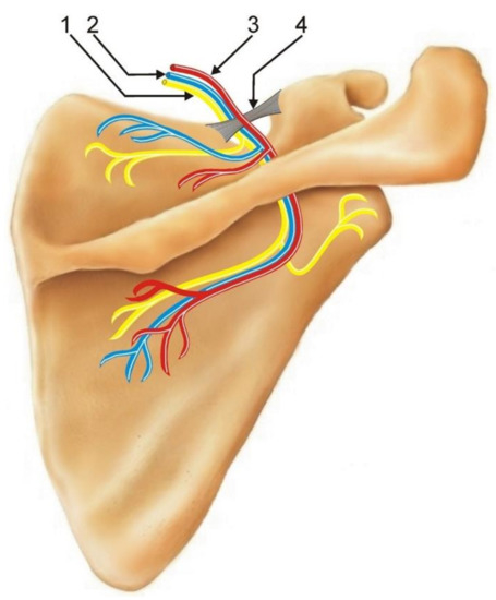 Schematic arrangements of structures passing around the suprascapular notch. 1: suprascapular nerve; 2: suprascapular vein; 3: suprascapular artery; 4: superior transverse scapular ligament (STSL).