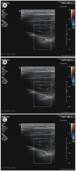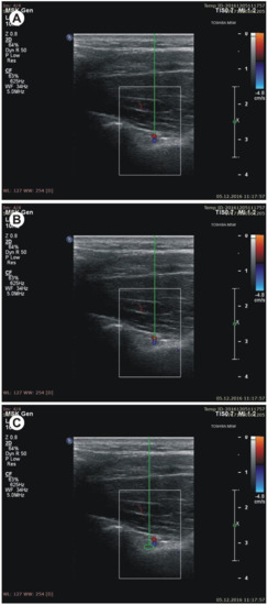 Figure 4. Measurements of the suprascapular notch region during ultrasonographic investigation. (A) the thickness of the soft tissue over the suprascapular artery; (B) the thickness of the soft tissue over the suprascapular vein; (C) the thickness of the soft tissue over the suprascapular nerve. - (g)