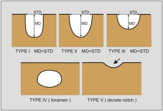 The shape of the suprascapular notch was classified based on its superior transverse diameter (STD) and maximal depth (MD). The notches were classified as follows, according to Polguj et al. [17]: type I—the maximal depth is greater than the superior transverse diameter (MD > STD); type II—the maximal depth is equal to the superior transverse diameter (MD = STD); type III—the superior transverse diameter is greater than the maximal depth (STD > MD) (Figure 5). In addition, a fourth category entitled type IV/V was used for all of the notches in which only the bony margin was visualised, without any depression. In the original classification by Polguj et al. [17], type IV is defined as an arrangement where the superior transverse scapular ligament is ossified and a bony foramen is formed, while type V bears a discrete notch. As it was impossible to sonographically differentiate between types IV and V, notches in which only the bony margin was visualised without a depression were classified as “type IV/V” [21].