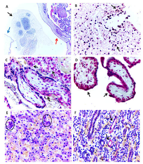Histopathological aspects and positive immunostaining of the ZIKV-infectedmiscarriage (Case 1). (A) Embryonic tissue (black arrow) within the yolk sac (blue arrow) and placenta (red arrow) (HE, 100×). (B) Positive immunostaining for ZIKV antigens in embryonic tissue (IHC, SAAP, 400×). (C,D) Positive immunostaining for ZIKV in placental chorionic villi (IHC, SAAP, 400×). (E) Positive immunostaining to ZIKV observed in the liver in hepatocytes (circle) (Case 3) (IHC, SAAP, 400×). (F) Positive immunostaining to ZIKV observed in the kidney in renal tubule (black arrows) (Case 3) (IHC, SAAP, 400×).