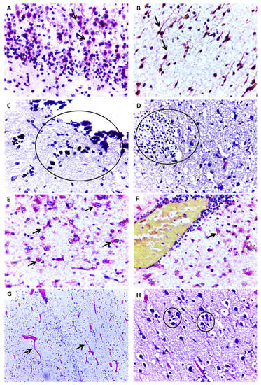 Representative histopathological changes and positive immunostaining in central nervous tissue of ZIKV-positive microcephaly cases by ZIKV. (A,B) Cellular disorganization in the cortical layer and positive immunostaining (arrow) for ZIKV antigen in neurons (Case 4) (IHC, SAAP, 400×). (C) Foci of dystrophic calcification in parenchyma with degenerative necrotic lesion (Case 6) (HE, 400×). (D) Gliosis in parenchyma with degenerative necrotic lesion (Case 6) (HE, 400×). (E,F) Positive immunostaining for ZIKV in neurons and astrocytes with perivascular inflammatory infiltrate (Case 6) (IHC, SAAP, 400×). (G) Significant vascular proliferation, edema and vessel congestion (arrows) (Case 11) (HE, 100×). (H) Pyramidal neurons of the cerebral cortex with neuronophagy, satelitosis, and gliosis (circles) (Case 11) (HE, 400×).