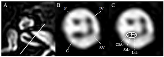 Axial and oblique sagittal three-dimensional (3D) T2-VISTA MRI of the normal ear at the level of the internal auditory canal. (A) The oblique sagittal image was established with the baseline perpendicular to the course of the nerve in the midpoint of internal auditory canal (IAC) of an axial image. (B) In the anterior aspect of the IAC, the facial nerve lies superiorly, whereas the cochlear nerve lies inferiorly. In the posterior aspect of the IAC, the superior vestibular nerve lies superiorly, whereas the inferior vestibular nerve lies inferiorly. (C) For the evaluation of cochlear nerve integrity, the short diameter (Sd, mm), long diameter (Ld, mm), and cross-sectional area (CSA, mm2) were measured as indicated. F: facial neve, C: cochlear nerve, SV: superior vestibular nerve, IV: inferior vestibular nerve.