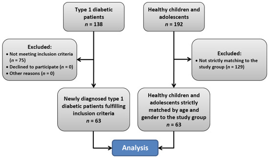 This pair-matched, case control study was carried out between March 2012 and August 2014. Sixty-three children and adolescents (28 girls, 44.4%) with type 1 diabetes hospitalized in the Clinical Department of Pediatrics with the Pediatric Neurology Unit at the Clinical Regional Hospital No. 2 in Rzeszow comprised the study group. The flow chart demonstrating the selection of the study and control groups is presented in Figure 1, while characteristics of both groups are presented in Table 1.