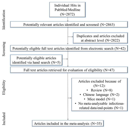 The initial search yielded 2872 citations. Of these, 2822 were duplicates and/or removed after title/abstract evaluation. Five manuscripts were identified using a manual search. Forty-seven articles underwent a full-text review, and some were excluded because they were reviews/meta-analysis/systematic review (N = 8), in the Chinese language (N = 2), mice model (N = 1), and contained no meta-analyzable infectious related data/end-points (N = 1). Eventually, 35 studies were included in the meta-analysis [39,40,41,42,43,44,45,46,47,48,49,50,51,52,53,54,55,56,57,58,59,60,61,62,63,64,65,66,67,68,69,70,71,72,73] (Figure 1).