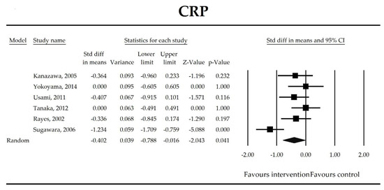 The effect size (standardized mean difference) for the concentration of CRP in patients taking probiotics (intervention) vs. no probiotics (control).