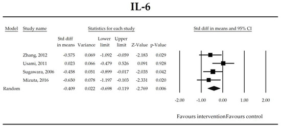 The effect size (standardized mean difference) for the concentration of IL-6 in patients taking probiotics (intervention) vs. no probiotics (control).