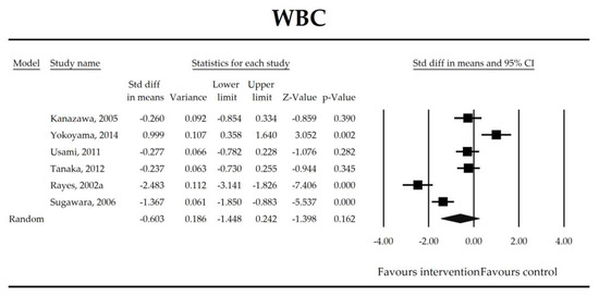 The effect size (standardized mean difference) for the concentration of WBC in patients taking probiotics (intervention) vs. No probiotics (control).