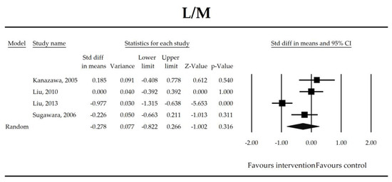 The effect size (standardized mean difference) for the lactulose/mannitol (L/M) ratio in patients taking probiotics (intervention) vs. no probiotics (control).