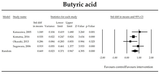 Putatively factors associated with the mechanism of pro/synbiotic action were searched with a focus on gut barrier integrity. These included: (i) bacterial translocation, (ii) lactulose/mannitol permeability test, and (iii) short chain fatty acids (butyrate, acetate, propionate) concentration, as well as non-specific markers of inflammation: (iv) C-reactive protein, (v) IL-6, and (vi) WBC counts. Diamine oxidase (DAO) activity was analyzed in two studies only [40,58], therefore excluded from metanalysis. CRP and IL-6 were significantly decreased (SMD: −0.40, 95% CI [−0.79, −0.02], p = 0.041; SMD: −0.41, 95% CI [−0.70, −0.12], p = 0.006, respectively) and short chain fatty acids (SCFAs)–acetic, butyric and propionic acids–were elevated (SMD: 1.78, 95% CI [0.80, 2.76], p = 0.0004; SMD: 0.67, 95% CI [0.37, 0.97], p = 0.00001; SMD: 0.46, 95% CI [0.18, 0.73], p = 0.001, respectively) in patients supplemented with probiotics. No other statistically significant results were found. Results are presented in Table 3 and Figure 2, Figure 3, Figure 4, Figure 5, Figure 6, Figure 7, Figure 8 and Figure 9.