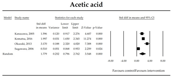The effect size (standardized mean difference) for the concentration of acetic ratio in patients taking probiotics (intervention) vs. no probiotics (control).