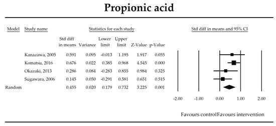 The effect size (standardized mean difference) for the concentration of propionic ratio in patients taking probiotics (intervention) vs. no probiotics (control).