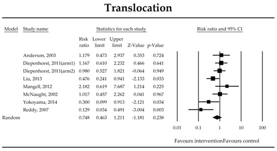 The effect size (risk ratio) for the overall effects of probiotics in the prevention of bacterial translocation.