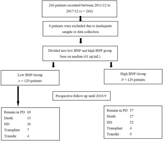 Flow chart of patient selection for this study. BNP, brain natriuretic peptide; HD, hemodialysis; PD, peritoneal dialysis.