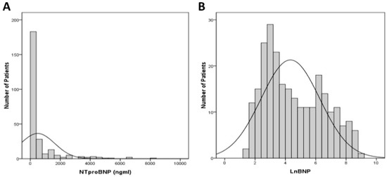 Distribution of serum NT-proBNP in the entire cohort. (A) NT-proBNP levels. (B) Natural log-transformed NT-proBNP levels. NT-proBNP, N-terminal pro-Brain type natriuretic peptide.