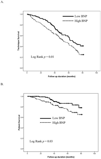 Kaplan–Meier based technique survival curves (A) and overall survival curves (B) of PD patients with high or low NT-proBNP levels at baseline. BNP, brain-type natriuretic peptide; PD, peritoneal dialysis.