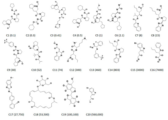 Two-dimensional structures of 20 training set compounds employed for the generation of ligand-based pharmacophore model. The experimentally determined half maximal inhibitory concentration (IC50) values are expressed in nmol/L in parenthesis.