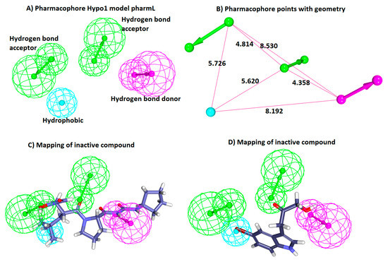 Characteristic four-featured HypoGen-guided pharmL. (A) PharmL consists of four features, including two hydrogen bond acceptor (HBA), one hydrogen bond donor (HBD), and one hydrophobic (HyP). (B) The geometry of the pharmL with its corresponding pharmacophore points. (C) Aligning of the most active compound to the model shows that it has mapped with all the features of pharmL. (D) Aligning of the inactive compound shows that it has mapped with three features of pharmL.