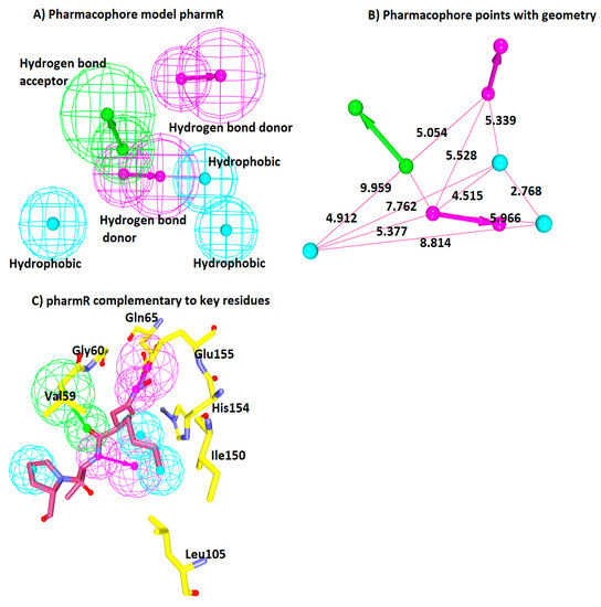 Furthermore, it was observed that the HBA and HyP features were present in all the models, showing their importance in the inhibition of the SaPDF. Moreover, these features were consistently observed in the models generated from the ligand-based pharmacophore approach (Table 3). From this, it can be deduced that the HBA and HyP features might be prominent in inducing the inhibitory mechanism. Furthermore, to select an ideal pharmacophore, the Pharmacophore Comparison module obtainable with the DS was employed. This step was conducted to secure the most reliable structure based model demonstrating the lowest RMSD with the ligand-based model. Correspondingly, the first model has rendered lower RMSD as compared to the other nine models and additionally has shown the complementarity against the catalytic active residues (Table 4 and Figure 3C). Therefore, this model was chosen and was labelled as pharmR. The pharmR contains six features, one HBA, two HBD, and three HyP features, which are complementary to the key residues. The pharmacophore features and the interfeature distance are represented in (Figure 3A,B). The six obtained features were complementary to the key residues. The HBA was complementary to the Val59 and Gly60 residues. One HBD was in the vicinity of Gln65 and Glu155. The two hydrophobic features were prompted from His154, Ile150, and Leu150. The third hydrophobic bond was noticed with the pentane ring of the ligand and the key residue Val59 (Figure 3C).