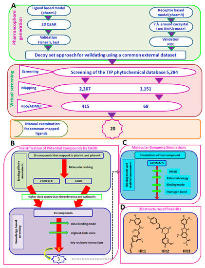 Computational methods to retrieve the potential candidate compounds. (A) Pictorial depiction of the generation of pharmacophore models and virtual screening process. (B) Sequential steps involved in binding affinities and knowledge based screening for potential compounds. (C) Evaluation of the binding modes and the stability of the final complex compounds through molecular simulations. (D) Two-dimensional representation of the potential compounds.