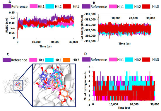 MD studies have been extensively exploited to decipher the behaviour of the complex molecules at the atomic level. In the current study, the MD simulations were conducted to authenticate the docking results and binding stability and to affirm the binding modes by monitoring the orientation of the protein–ligand complex during 30 ns (Figure 5C). The best-docked poses obtained from the molecular docking results were taken as the initial structures for the MD. The findings were inferred as root mean square deviation (RMSD) of the protein backbone atoms, the potential energies for each system by interpreting the stability of the backbone atoms throughout the simulations, binding mode analysis, and hydrogen bond count (Figure 5C). The RMSD profiles of the three hits and reference were found to be below 2 nm throughout the simulations inferring that the systems were well converged. Upon examining the average RMSD of the reference, it was recorded to be 0.16 nm, while Hit1, Hit2, and Hit3 rendered values of 0.11 nm, 0.12 nm, and 0.12 nm, respectively (Figure 6A). Additionally, the potential energy profiles of the four systems remained relatively stable between −3.87× 105 and ~−3.85× 105 (Figure 6B). These results elucidate the stable nature of the systems during 30 ns.