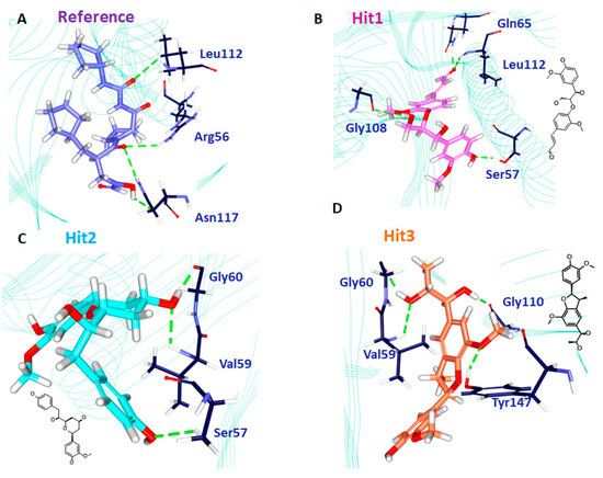 Intermolecular hydrogen bond interactions of the reference (A), Hit1 (B), Hit2 (C), and Hit3 (D), respectively.