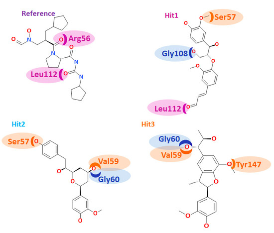 Furthermore, we meticulously contemplated on the accommodation of the reference and the hits at the active site of the protein. Structurally, the binding pocket of the PDF was further divided into three subsites, namely, S1’, S2’, and S3’, respectively [1]. The residues in vicinity to S1’ subunit of Staphylococcus aureus is comprised of Gly60, Leu105, Gly108, Glu109, Ile150, Val151, His154, and Glu155. The S2’ subunit was in proximity to Arg56, Cys111, and Leu112 while the S3’ subunit is encompassed of residues such as Ser57, Gly58, Val59, and Tyr147.