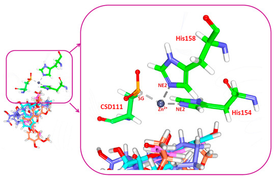 During the docking simulations, the bonded model of Zn2+ ion chelation was applied as reported previously [3] in which the coordinate bonds between the Zn2+ ion and the residues interacting with the protein were treated as covalent bonds. Moreover, the distance constraints for the three residues, CSD111, His154 and His158 that are involve in the Zn2+ ion were configured between 2.3–2.5 Å (Figure 9). The resultant molecular docking results have demonstrated a distance constraint within the fixed length without any variation. However, it is worth noting that the O23 atom of Hit1 has displayed an interaction with the metal ion, while Hit2 and Hit3 did not generate any interaction with the metal ion. Furthermore, it was observed that the hydrogen bonds of Hit1 were prompted from three subsites, thereby showing its significance as the most valuable antimicrobial agent (Figure 8). Taken together, the obtained results illuminate the importance of the hit compounds as potential PDF inhibitors. The three hits demonstrated higher dock scores than the reference compounds (Table 8), complemented by enhanced inhibitory activities. Additionally, the hits depicted all the features of the pharmL and pharmR, correspondingly (Supplementary Figure S4) and the two-dimensional structures are represented in Figure 5D. These findings suggest that the identified hits serve as potential broad spectrum antibiotic agents and further may serve as novel scaffolds in determining new drugs.