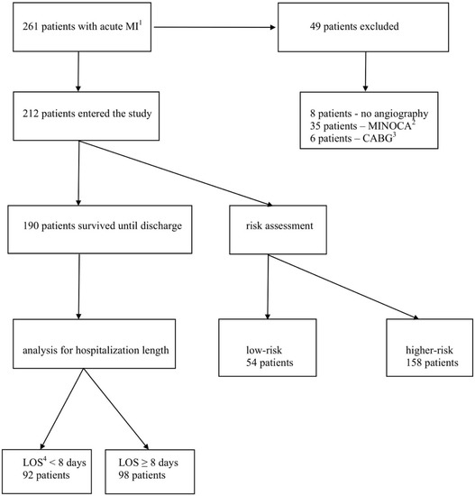 - Berger, A.K.; Duval, S.; Jacobs, D.R., Jr.; Barber, C.; Vazquez, G.; Lee, S.; Luepker, R.V. Relation of length of hospital stay in acute myocardial infarction to postdischarge mortality. Am. J. Cardiol. 2008, 101, 428–434. [Google Scholar] [CrossRef] [PubMed]