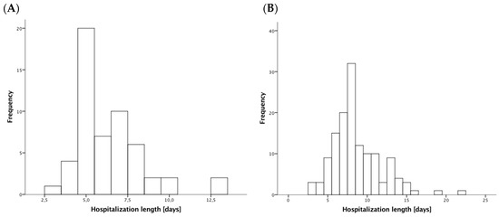 Histogram of length of hospital stays in low-risk patients (A) and higher-risk patients (B).