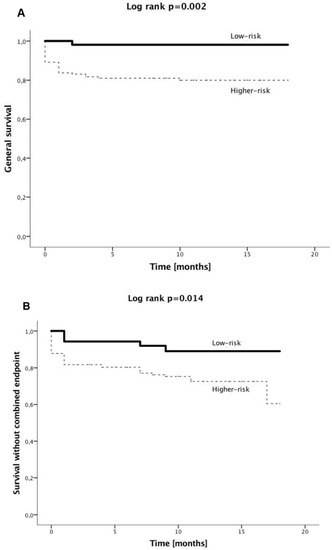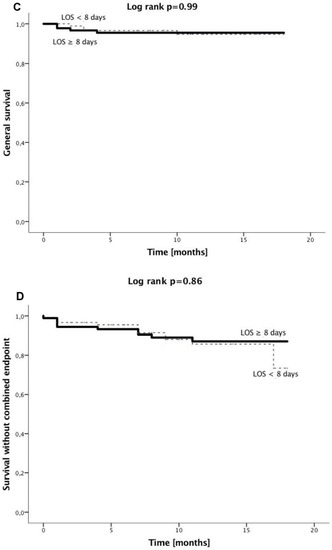 There were no significant differences in rates of clinical events occurring in patients with shorter (<8 days) and longer (≥8 days) hospitalization (Table 5). A Kaplan–Meier analysis showed higher probabilities of general survival and survival without a combined endpoint in low-risk patients compared to the higher-risk group. There were no significant differences in the Kaplan–Meier analysis in relation to hospitalization length categories (Figure 3).