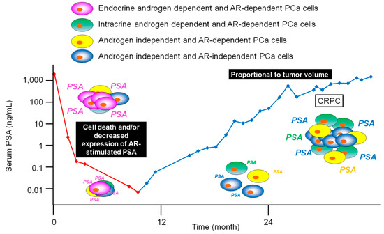The goal of ADT treatment for PCa patients is to downregulate concentrations of circulating androgen or block transcriptional activation of the AR [17]. The decrease in PSA levels after primary ADT most likely results from tumor cell death and/or decreased expression of AR-stimulated PSA in surviving tumor cells (Figure 1). As a result, in some cases, primary ADT may have larger effects on PSA production than on tumor survival.