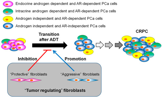 “Tumor regulating fibroblasts” and the role of fibroblasts after ADT in PCa patients. “Protective” fibroblasts inhibit the transition of PCa cells from AR-dependent to AR-independent, whereas “aggressive” fibroblasts promote the transition from AR-dependent to AR-independent [7].