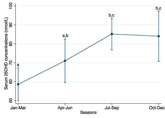 Mean 25OHD concentrations collected in Jul–Sep and Oct–Dec were similar and both significantly higher as compared to in Jan–Mar, but not in Apr–Jun (Bonferroni-adjusted, P < 0.0125 to account for the four-group comparison) (Figure 1). Marginal mean (95% CI) serum 25OHD concentrations were 58.5 (49.8, 67.2) nmol/L in Jan–Mar, 71.0 (59.5, 82.5) nmol/L in Apr–Jun, 85.2 (76.7, 93.6) nmol/L in Jul–Sep, and 84.0 (70.7, 97.3) nmol/L in Oct–Dec.