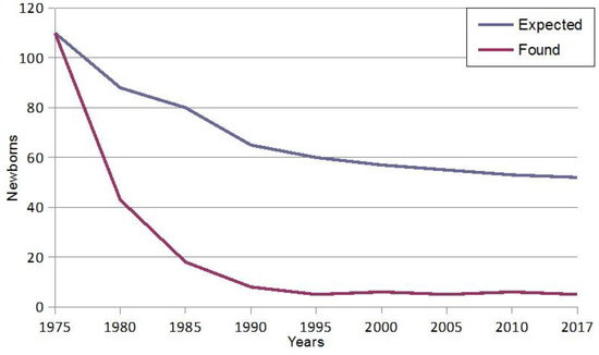 Figure 1 shows that thanks to the forty years of continuous prevention programs of β-thalassemia in Sardinia we witness a strong decrease in the number of affected fetuses [49].