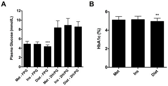 (A) Fasting plasma glucose (FPG) and 2-h plasma glucose post 75 g oral glucose tolerance test (OGTT) (2HrPG) for women diagnosed with GDM that were subsequently managed with metformin (Met), insulin (Ins) or diet and lifestyle modification (Diet). (B) HbA1c at diagnosis of GDM for women subsequently treated with metformin, insulin or diet and lifestyle modification. Results expressed as mean ± standard deviation. ** p < 0.01; *** p < 0.0001.