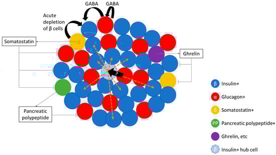 Schematic diagram showing the interdependency of islet cells. Evidence in the literature points to the possibility of the transdifferentiation (solid black arrows) of α-cells (red circle) via stimulation by gamma aminobutyric acid (GABA), and δ-cells (yellow circle) into insulin-containing β (like)-cells (blue circle). It is currently unclear whether the replenishment of β-cells from the transdifferentiation of α-cells is able to replace hub β-cells (light blue circle) which influence (yellow arrows) the function of other β-cells. Somatostatin, released from δ-cells, can inhibit the release of glucagon, insulin, and pancreatic polypeptide from α-, β-, and PP cells (green circle), respectively. Pancreatic polypeptide, released from PP cells, can inhibit the release of glucagon. Ghrelin, released from ghrelin-positive islet cells (purple circle), can inhibit insulin and somatostatin secretion.