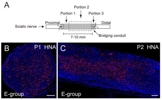 At 8 weeks after transplantation, recipient nude mice were given an overdose of pentobarbital (60 mg/kg, i.p.), and the animal was exsanguinated. Then, the sciatic nerve in each side was removed and fixed overnight in 4% paraformaldehyde/0.1 M phosphate buffer (4% PFA/PB), washed with graded sucrose (0–25%)/0.01 M phosphate-buffered saline (PBS) series, embedded in optimum-compound (O.C.T compound; Tissue-Tek, Sakura Finetechnical Co., Ltd., Tokyo, Japan) and then frozen at −80 °C, and stored until sectioned. Similarly, plantar flexor muscles (PLA, SOL, and GAS) were freshly removed and quickly frozen in isopentane pre-cooled with liquid nitrogen and stored at −80 °C until sectioned. Subsequently, in order to examine the bridged conduit, several 7 µm cross- and longitudinal sections were obtained from three portions, as shown in Figure 1A. Portion 1 was a cross-section showing the proximal portion of the conduit, portion 2 was a longitudinal section showing the midportion of the conduit, and portion 3 was a cross-sectional profile of the distal portion of the conduit. Engrafted human cells were detected by anti-human nuclear antigen (HNA, 1:100, 4 °C overnight; clone 235-1, Cy3 conjugate; Millipore, Temecula, CA, USA). The localization of the nerve fibers (axons) was determined by rabbit polyclonal anti-neurofilament 200 (N-200, 1:1000, room temperature for 1 h; Sigma, Saint Louis, MO, USA). The myelin formation was detected by rabbit polyclonal anti-myelin basic protein (MBP; 1:200, room temperature for 2 h; Millipore, Billerica, MA, USA). The total distribution of blood vessels was determined using rat anti-mouse CD31 monoclonal antibody (1:500, 4 °C overnight; BD Pharmingen, San Diego, CA, USA), and/or rabbit polyclonal anti-human CD31 (1:200, room temperature for 2 h; Abcam, Cambridge, UK). Immature Schwann cells were detected using rabbit anti-p75 polyclonal antibody (1:400, 4 °C overnight; CST, Boston, MA, USA) or mouse monoclonal antibody (1:100, 4 °C overnight; Abcam, Tokyo, Japan), and rabbit anti-glucose transporter 1 (GLUT-1, 1:100, room temperature for 1 h; Diagnostic BioSystems, Pleasanton, CA, USA) was used for identification of the perineurium. Muscle fibers were confirmed with rabbit polyclonal anti-fast myosin skeletal muscle heavy chain (1:300, room temperature for 1 h; Abcam, Tokyo, Japan). Reactions were visualized using Alexa Fluor-488, -594, -647-conjugated goat anti-rabbit, anti-rat antibodies (1:500, room temperature for 2 h; Molecular Probes, Eugene, OR, USA), respectively. Nuclei were counter-stained with 4′,6-diamidino-2-phenylindole (DAPI). Histological photographs were taken with a fluorescence multi focal projection system using Stereo Investigator (mbf Bioscience, MicroBrightField. Inc., Williston, VT, USA) and fluorescence microscopy (Olympus BX61 with U-HGLGPS and BX-UCB, Tokyo, Japan). Histological analyses were performed on all samples.
