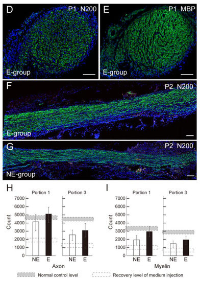 Axon and myelin recovery was evaluated at the proximal site (Portion 1) and distal site (Portion 3) in the conduit (Figure 1A) after 8 weeks of transplantation. Figure 1B,C shows typical engraftment of the transplanted human Sk-34 cells. The Sk-34 cells were evenly distributed in the conduit transversely (Portions 1 and 3) and longitudinally (Portion 2). Similarly, regenerated axon and myelin at portion 1 is shown in Figure 1D,E. Axonal regeneration in the longitudinal sections of both the E- and NE-group are also shown in Figure 1F,G. A similar trend, the axons running through the conduit, was evident in both groups. Then, these regenerated axons and myelin were counted and compared (Figure 1H,I). Axonal recovery of the E group reached the normal control level in Portion 1 and about 70% of normal in Portion 3 (Figure 1H). Similarly, myelin recovery in the E group showed almost 90% of the normal control level in Portion 1 and about 70% in Portion 3 (Figure 1I). On the other hand, the NE group showed consistently lower values than the E group, although these differences were not statistically significant. Note that both the present E and NE groups clearly showed significantly greater recovery than the conduit + medium injection level, based on our pooled data (see Figure 1H,I, and ref [6]).