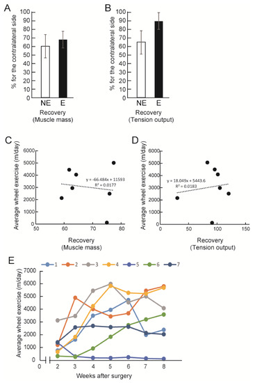 Recovery of downstream muscle mass and tension output, and individual exercise statistics. (A) Recovery of total muscle mass (gastrocnemius (GAS) + plantaris (PLA) + combined soleus (SOL)); (B) Recovery of tension output of the three muscles. Both markers are calculated based on the contralateral side. The E group consistently shows better recovery than the NE group; (C) Relationship between average wheel exercise (m/day) and muscle mass recovery; (D) Relationship between average wheel exercise (m/day) and muscle tension recovery; (C,D) shows individual plots, and there are no correlations; (E) Individual shift of exercise volume during recovery term.