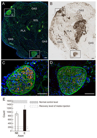 The number of axons of the tibial nerve branches that were apparent in the plantar flexor muscles was counted (Figure 3). The typical location of tibial nerve branches, as shown in Figure 3A,B, associate with the situation of plantar flexor muscles (GAS, PLA, SOL). These two branches include N200+ axons (Figure 3C,D). When these numbers are compared as the recovery ratio against the normal control levels, the E group showed about 73% recovery, with about 60% observed in the NE group (however, this difference is not statistically significant). Note that both groups showed significantly greater recovery than the medium injected case (our pooled data).