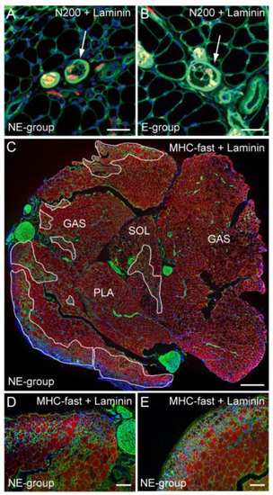 Detection of muscle spindles and pathological muscle fiber area. Typical muscle spindle in the NE (A, arrow) and E (B, arrow) group stained with N200 (red) and laminin (green). Both spindles are innervated, but irregular fiber diameters and central nuclei are observed in the NE group; (C) Detail of the pathological muscle fiber area in the whole muscle cross-section (GAS, PLA, SOL) stained with anti-myosin heavy chain (MHC) fast type (red) and laminin (green). These enclosed areas account for 17% as pathological area. A higher magnification of the typical pathological muscle fiber features is shown in (D,E). Severe irregular fiber diameters are evident. Blue staining in each panel is the nuclear staining of DAPI. Bars in (A,B) = 50 μm, (C) = 200 μm, and (D,E) = 100 μm.