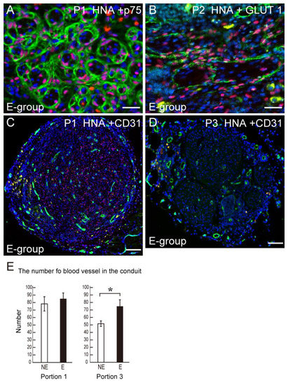 Differentiation of engrafted human Sk-34 cells into Schwann cells and perineurial cells, and the number of blood vessels in the bridging conduit. (A) Transplanted human Sk-34 cells (pink nuclei) expressed a newly formed Schwann cell marker p75 (green); (B) Transplanted human Sk-34 cells (pink nuclei) also formed new perineurium (green) showing differentiation into perineurial cells; (C) Typical staining of CD31 (green) as evidence of the number of blood vessels in the conduit. Blue staining in each panel is the nuclear staining of DAPI. P1 = position 1, P2 = position 2. Bars in A and B = 50 μm, C = 100 μm; (D) Statistical comparison of the formation of blood vessels in the conduit. There is no difference in the proximal Portion 1 between NE and E group, but a significantly higher value in (E) was observed in the distal end Portion 3. * p < 0.05.