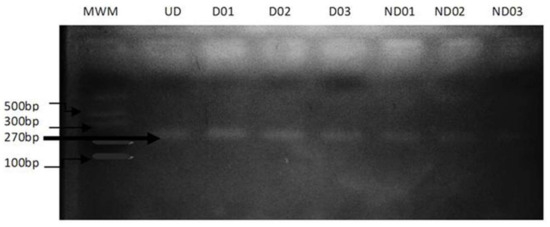 RFLP-PCR of PPARγ2 Pro12Ala Polymorphism. Samples were analyzed on a 3% agarose gel after restriction digest. D01–D03 = Samples for diabetic patients; ND01–ND03 = Samples for non-diabetic patients; UD = Undigested sample (control); MWM = Molecular weight marker.