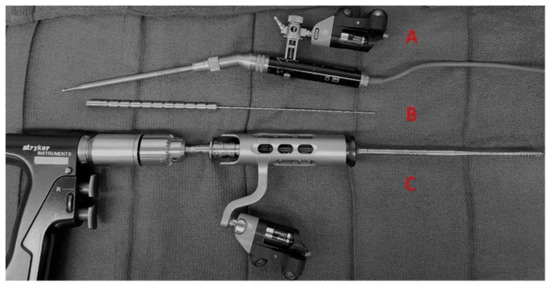 Instruments needed for safe placement of thoracic, lumbar, and sacral pedicle screws using the virtual screw technique. (A) Stryker electric drill with navigation tracker interface and 3-mm match stick drill bit. (B) Pedicle feeler. (C) Stryker Instruments Cordless Driver 3 with navigated tip interface coupling ring, tracker interface, handle interface, and tap.