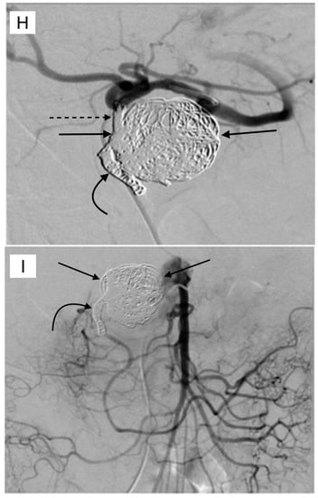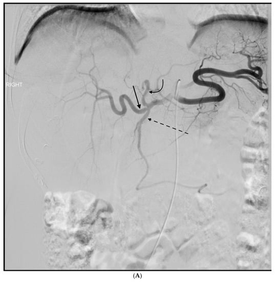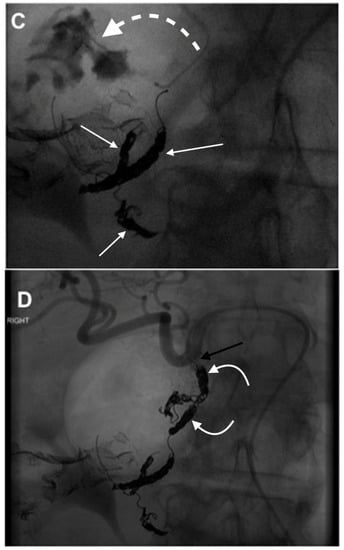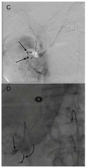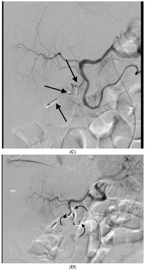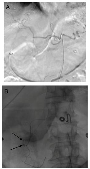 - Enriquez, J.; Javadi, S.; Murthy, R.; Ensor, J., Jr.; Mahvash, A.; Abdelsalam, M.E.; Madoff, D.C.; Wallace, M.J.; Avritscher, R. Gastroduodenal artery recanalization after transcatheter fibered coil embolization for prevention of hepaticoenteric flow: Incidence and predisposing technical factors in 142 patients. Acta Radiol. 2013, 54, 790–794. [Google Scholar] [CrossRef] [PubMed]