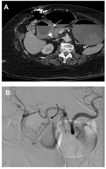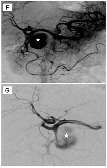 - Kim, D.Y.; Joo, J.K.; Ryu, S.Y.; Kim, Y.J.; Kim, S.K.; Jung, Y.Y. Pseudoaneurysm of gastroduodenal artery following radical gastrectomy for gastric carcinoma patients. World J. Gastroenterol. 2003, 9, 2878. [Google Scholar] [CrossRef] [PubMed]